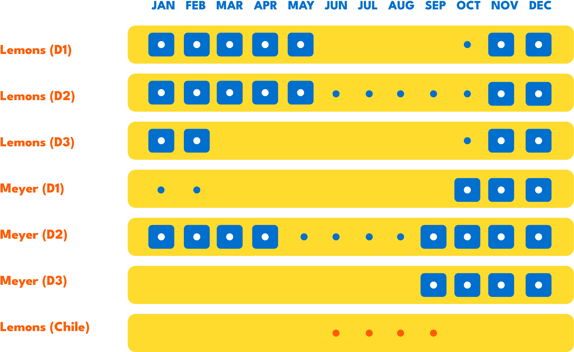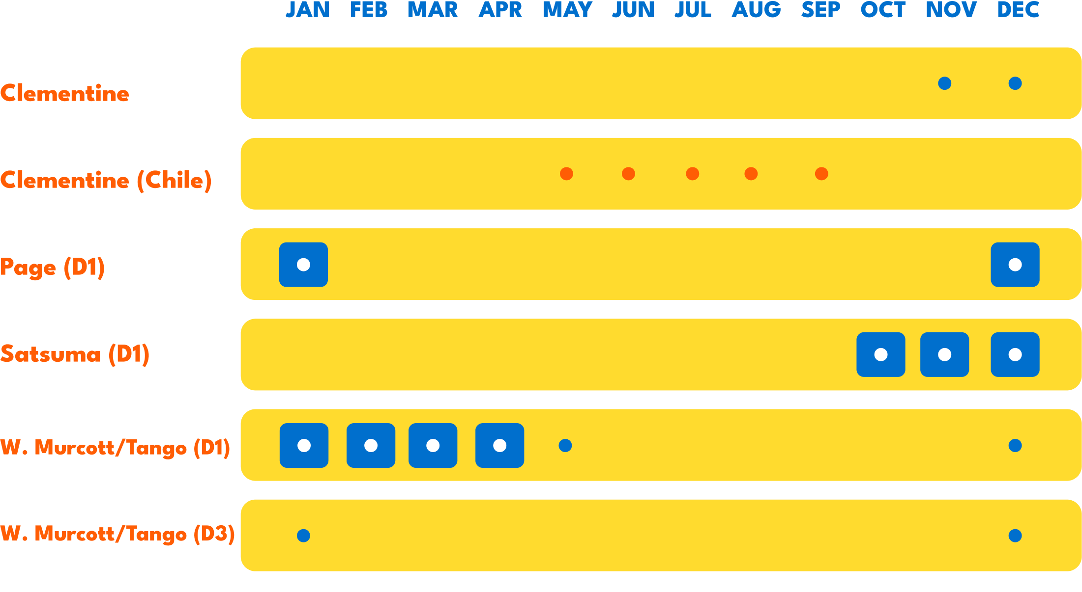 Fruits and vegetables typically grown in California are listed on the calendar below. Click on the tabs below to see what is available for that particular month. Availability varies according to growing conditions and time of the year.